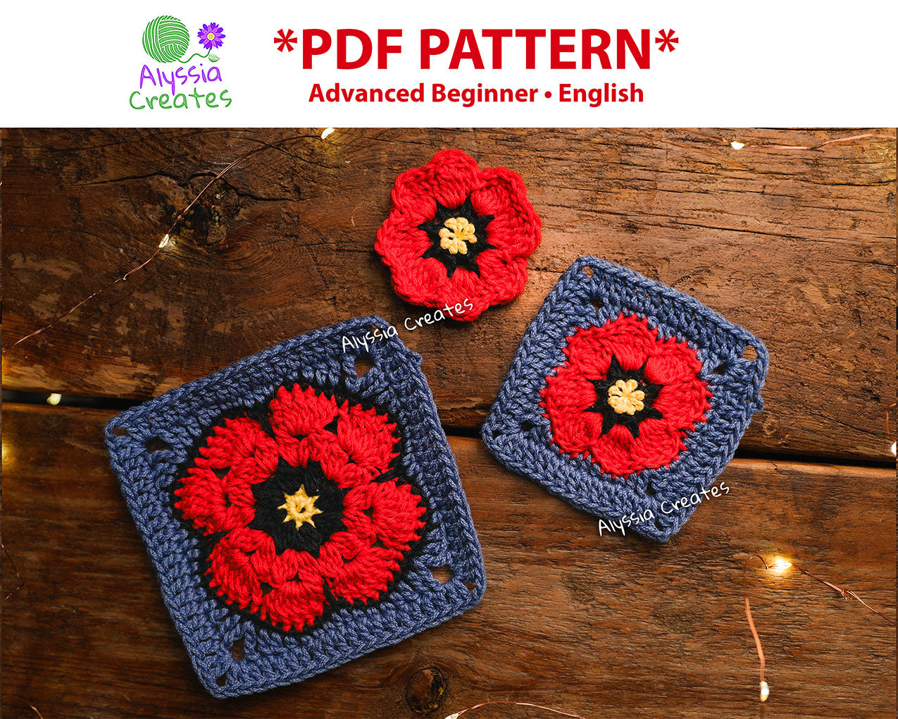 Small and Large Poppy Flower Granny Square Crochet PDF PATTERN (English)
